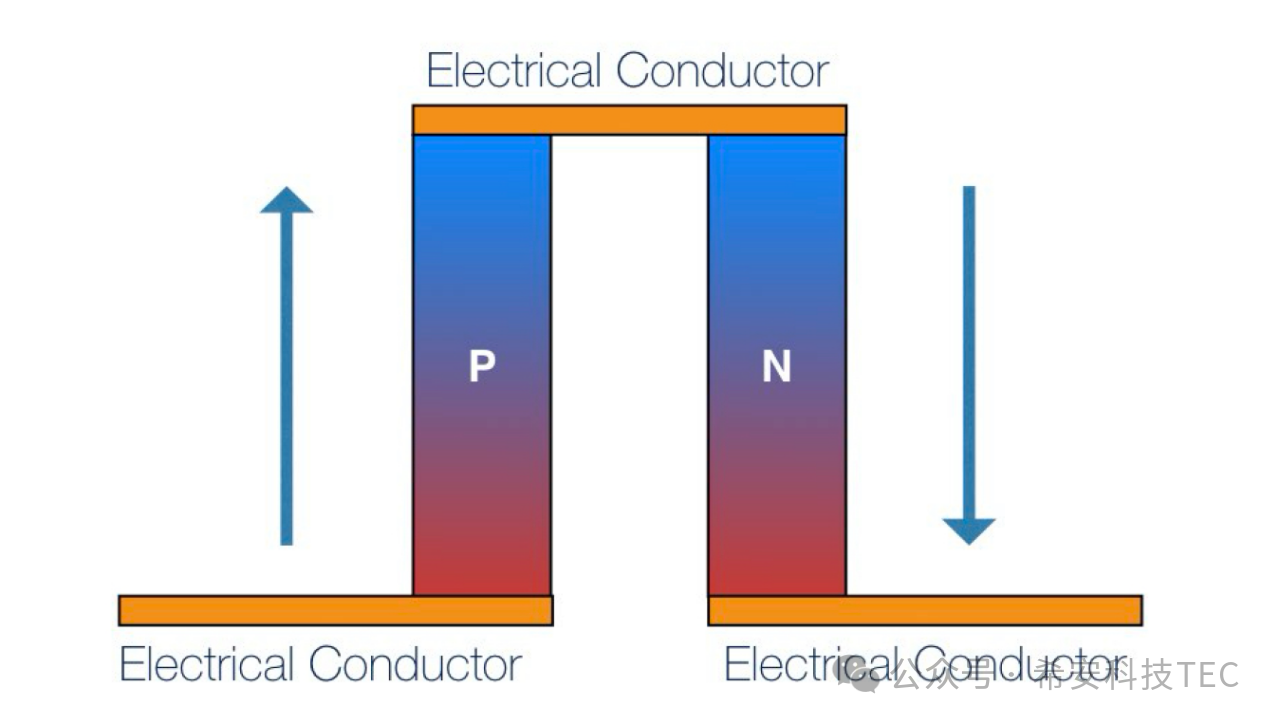 Keď jednosmerný prúd prechádza cez termočlánok, polovodičové zrná typu P a N (typ P (doplnené trojmocnými prvkami, ako je bór, ktoré majú otvory) vedú elektrinu cez otvory a stanú sa kladne nabité; Dvojica typu N (dotovaná päťmocnými prvkami, ako je fosfor), ktorá vedie elektrickú energiu elektrónmi a je záporne nabitá.
