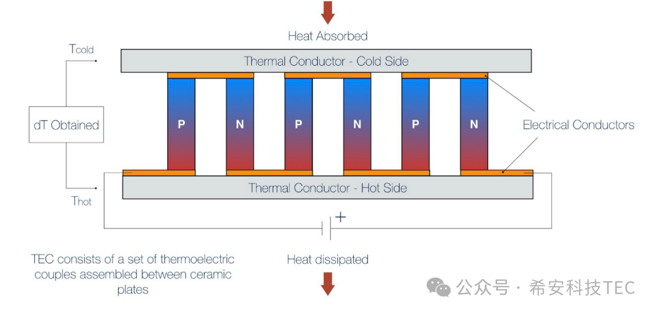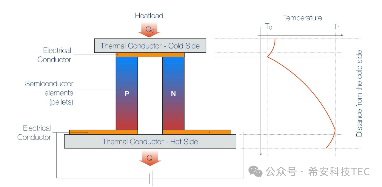 Tepelné vodiče sa pridajú na oba konce termočlánku, ako je znázornené na nasledujúcom obrázku: vytvorí sa kompletný TEC. Keď je TEC napájaný, horný povrch absorbuje teplo, ktoré sa nazýva studený koniec, a absorbované teplo je Q0. Spodný povrch uvoľňuje teplo a nazýva sa horúci povrch, pričom uvoľnené teplo je Q1 ; Q1= Q0+Qtec